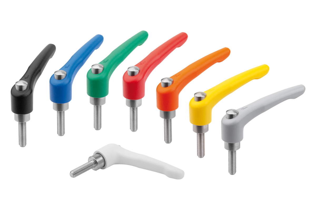 Clamping levers with external thread and protective cap, steel parts stainless steel, matt textured