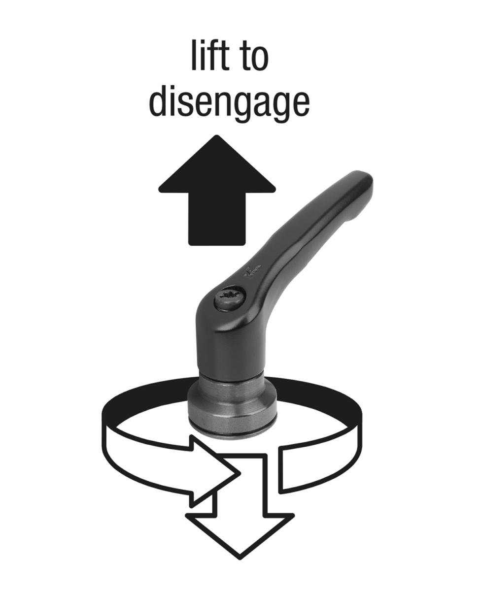 In the default position, the handle is engaged with the threaded insert through a toothed ring. By lifting the handle, it can be repositioned and re-engaged in the toothed ring by spring force.