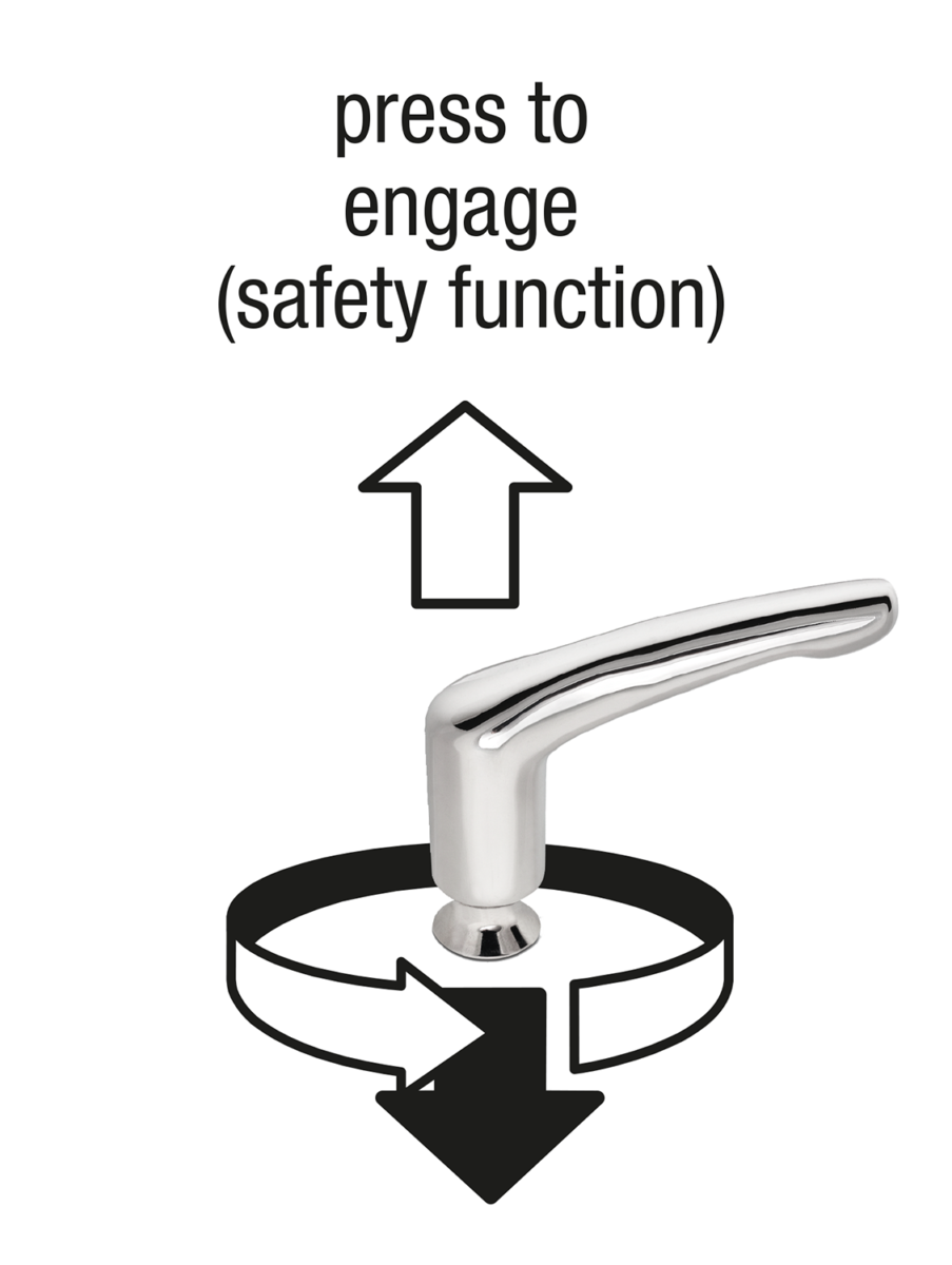 Clamping lever designed for the hygienic sector. The completely closed grip part and the shaft seal prevent contamination of the lever internal workings. Additionally, the screw insert has a conical collar so that the fastening point can be hygienically sealed with the Hygienic USIT® sealing and shim washer.