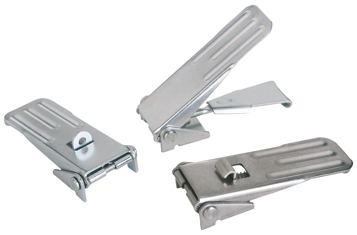 Latches, steel or stainless steel, with adjustable metal plöate hooks for up to 4000N, fastening holes concealed, long version, Form C, with padlock bracket