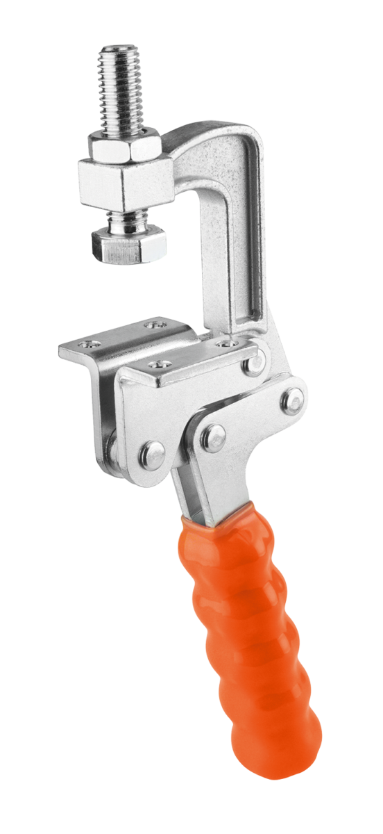 The pivot jaw toggle clamp is ideal for applications in which there is little mounting space at the sides. In this case the clamp plate is secured from below to the work surface.