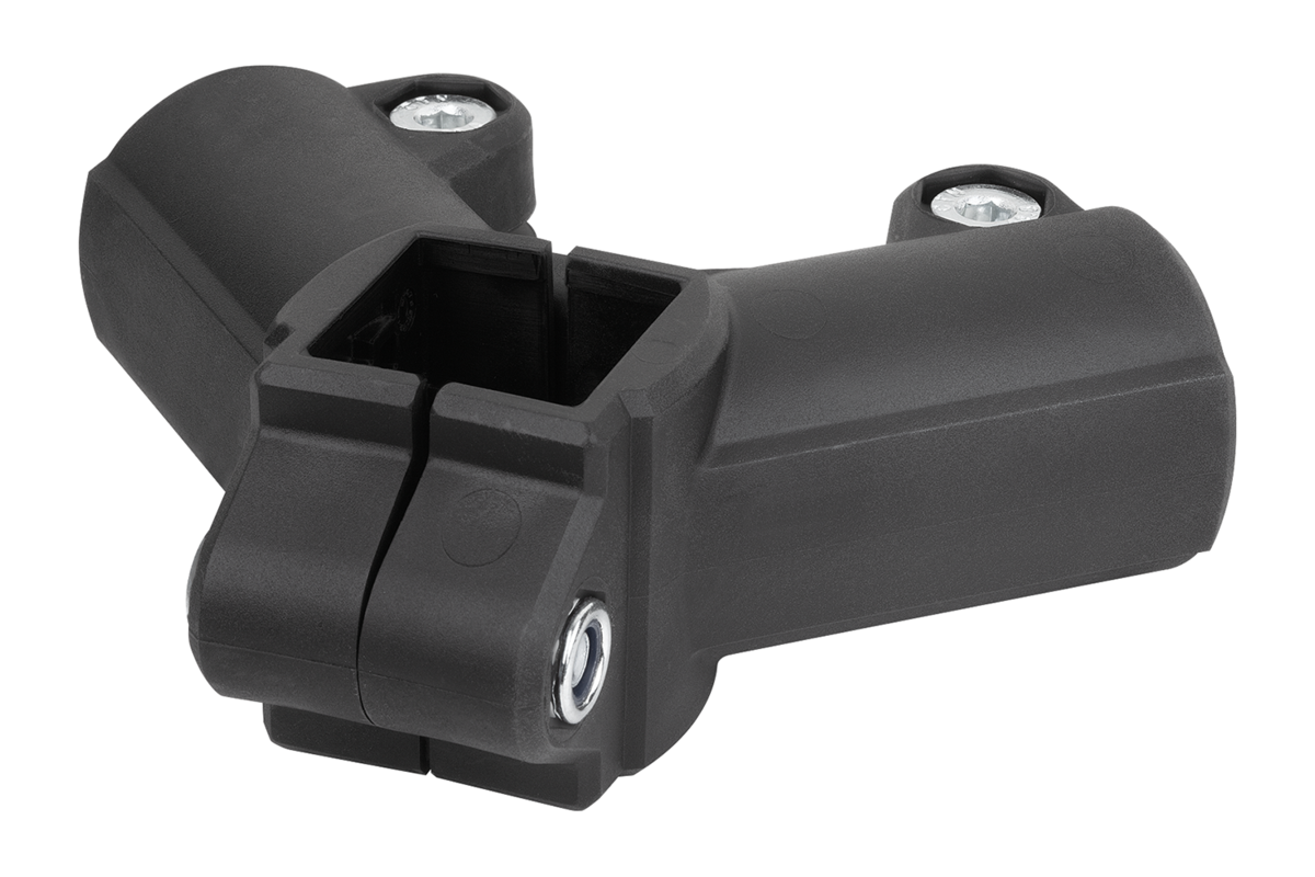 The right-angle tube connector can be used to clamp 30 mm square and round tubes. Use reducer sleeves K0491 or K0492 if smaller tubes are to be clamped or a conversion from round to square tubes ”or vice versa” is required.