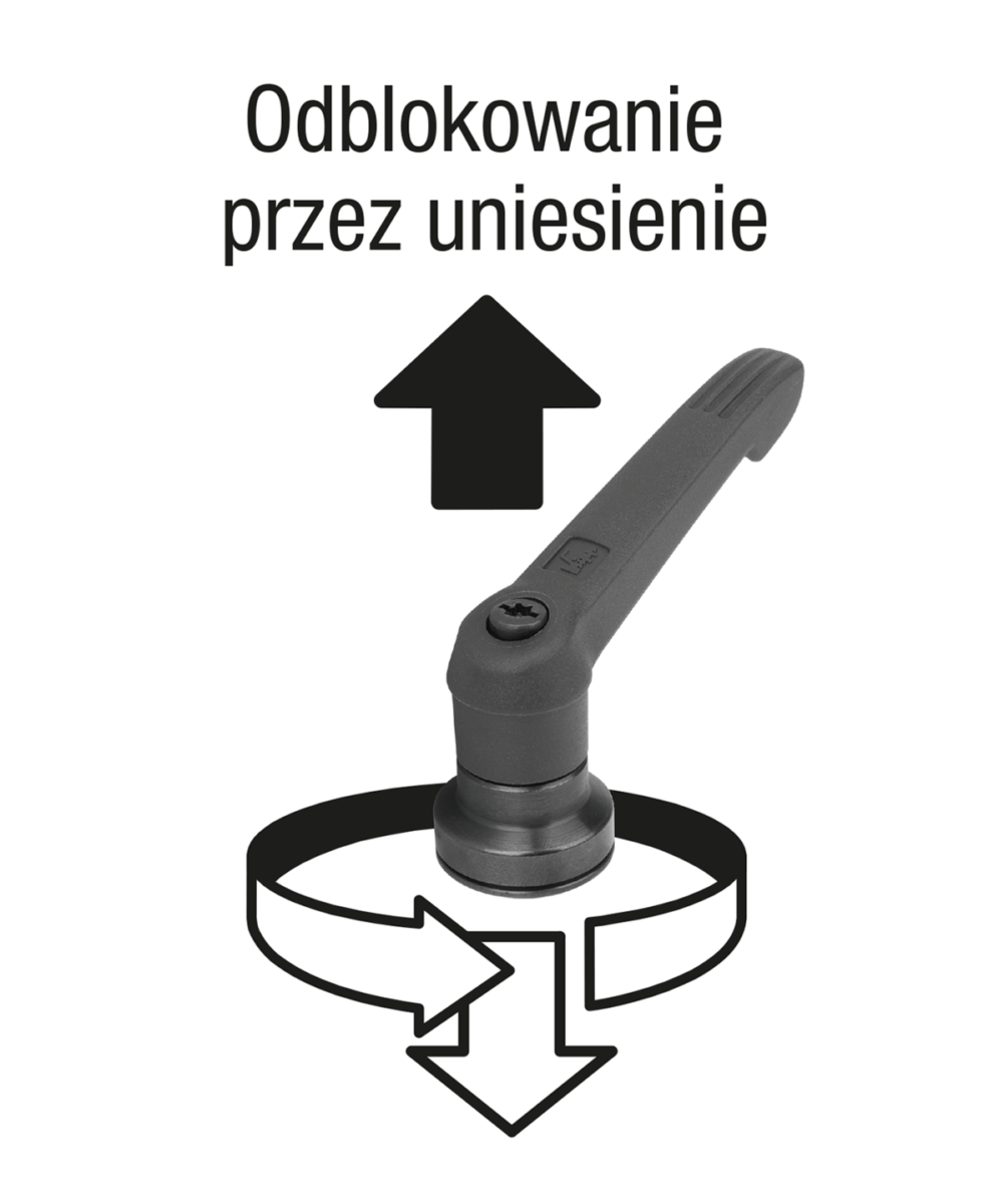 Część chwytowa w pozycji swobodnej jest zazębiona z wkładką zębatą, dzięki czemu rękojeść można mocować lub odblokowywać. Unosząc część chwytową można zmienić jej położenie, a oddziaływanie wbudowanej sprężyny spowoduje jej ponowne zablokowanie się w wieńcu zębatym.