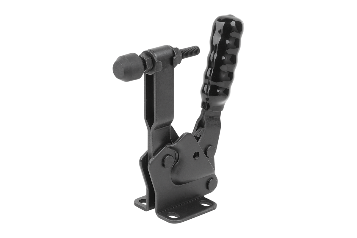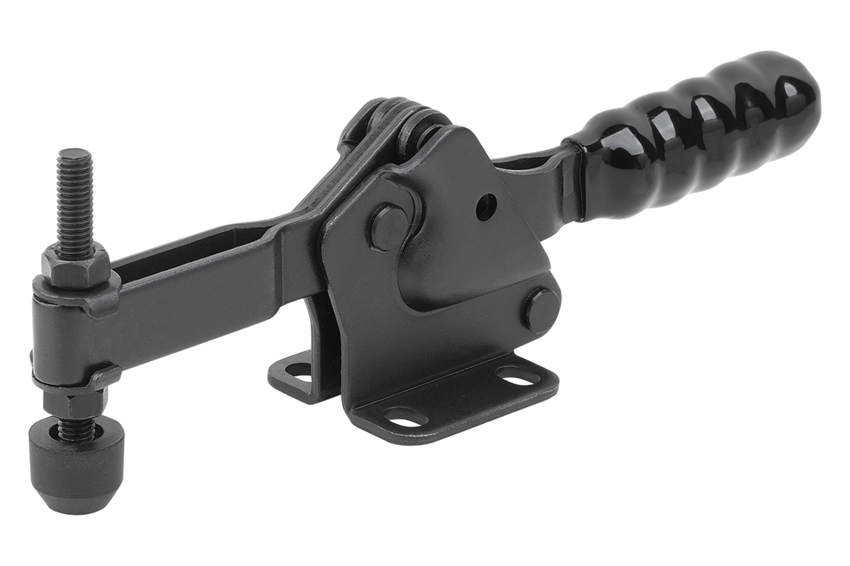 Dociskacze szybkomocujące czarne, poziome z przylgą poziomą i przestawnym trzpieniem dociskowym, forma A, małe