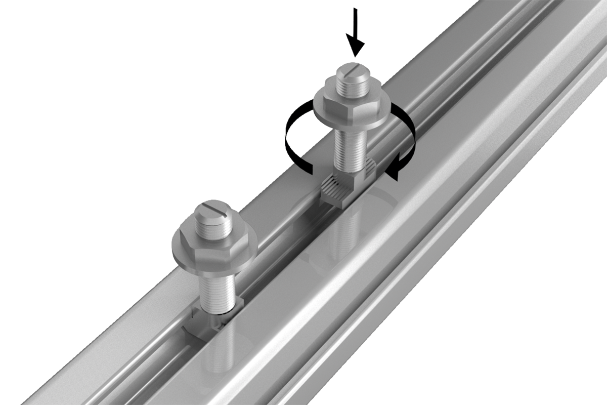 Uniwersalny element mocujący. Śruba z łbem młoteczkowym jest wsuwana bocznie do rowka profilowego, dzięki czemu możliwe jest również umieszczenie jej w już istniejących systemach. Żłobkowanie na powierzchni anodowanej zapewnia niezawodne, przewodzące elektrycznie połączenie.