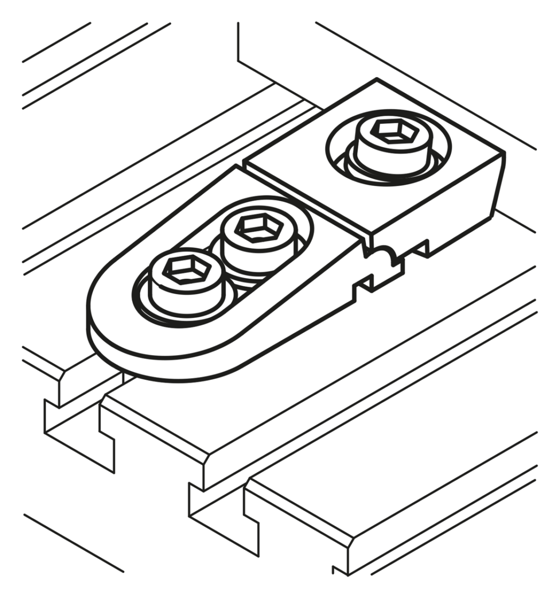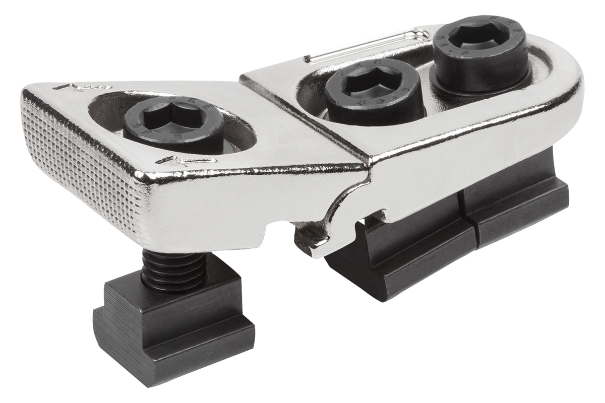 Dociski boczne do rowków teowych umożliwiają mocowanie zwłaszcza niskich przedmiotów obrabianych. Siła dociskająca w dół dodatkowo dociska przedmiot obrabiany do stołu maszynowego.