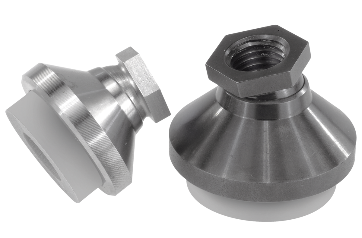 Podana w tabeli obciążalność jest wartością zalecaną, której stałe obciążenie statyczne na element tłumiący drgania nie powinno przekroczyć.To obciążenie statyczne odpowiada dociskowi 0,4 N/mm², który pozwala materiałowi uzyskać optymalne właściwości tłumiące drgania. Przy tym uwzględniono, że podczas obciążenia dynamicznego dochodzi do dodatkowego docisku dochodzącego do 0,6 N/mm². Podkładka tłumiąca drgania pochłania wibracje i zabezpiecza przed ślizganiem. Stopki dociskowe (bez tłumienia drgań) – patrz K0395.
