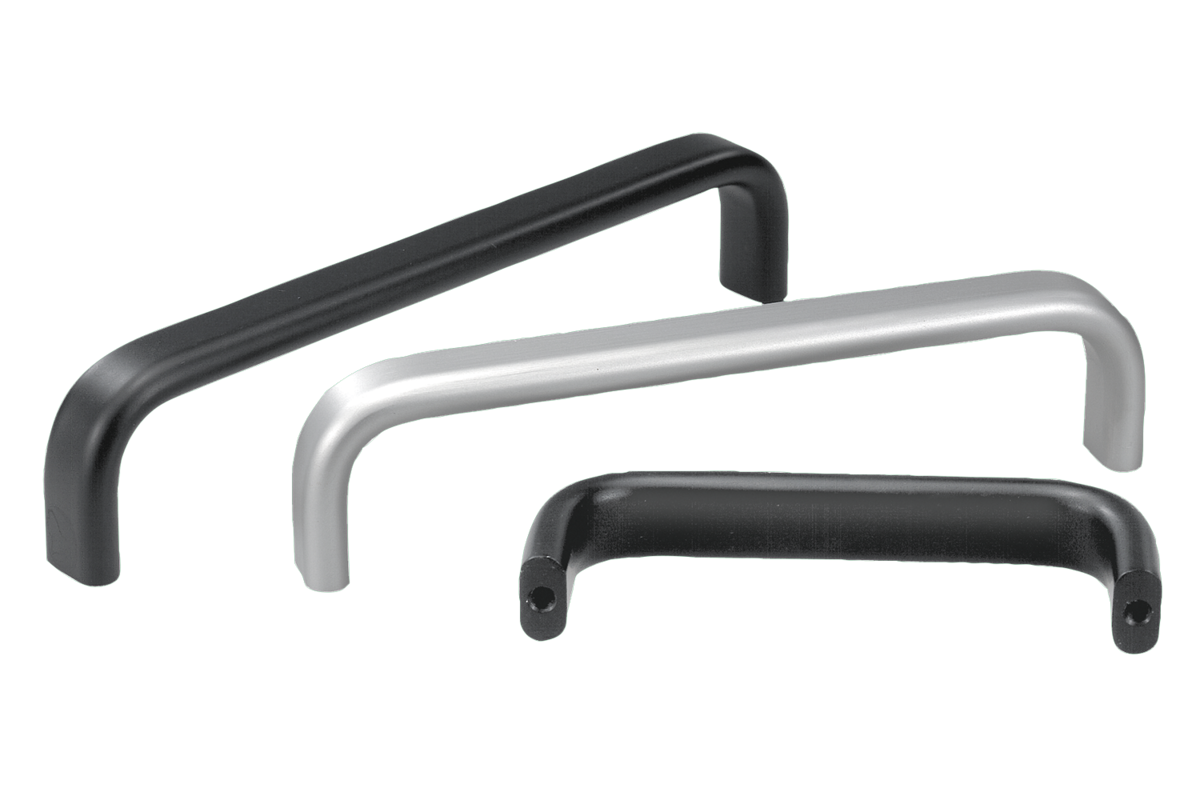 Eleganckie uchwyty pałąkowe z płaskiego profilu aluminiowego nadają się szczególnie do maszyn, urządzeń, przyrządów, aparatów itp.