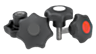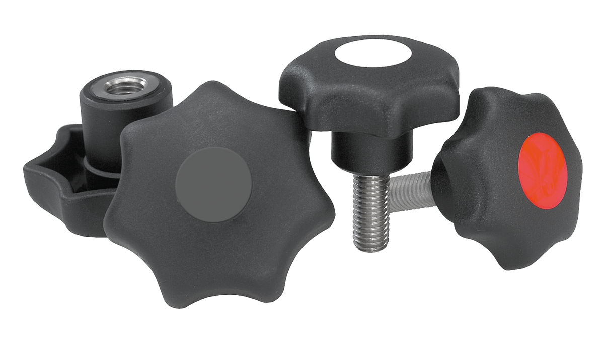 Pokrętła gwiaździste podobne do DIN 6336, elementy stalowe ze stali nierdzewnej, gwint wewnętrzny z pokrywą, forma K