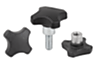 Pokrętła krzyżowe z tworzywa sztucznego z obsadzoną tuleją stalową, forma L: gwint zewnętrzny
