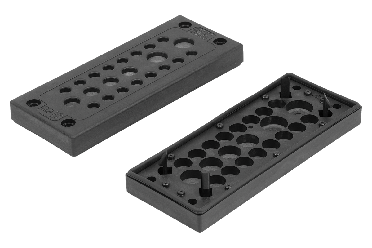 Płytki z przepustami kablowymi nadają się do przeprowadzania przewodów bez wtyków (przewodów niekonfekcjonowanych). Możliwe jest wprowadzanie kabli, przewodów, węży, przewodów pneumatycznych i hydraulicznych.