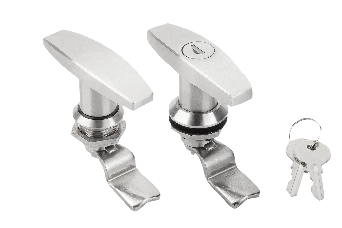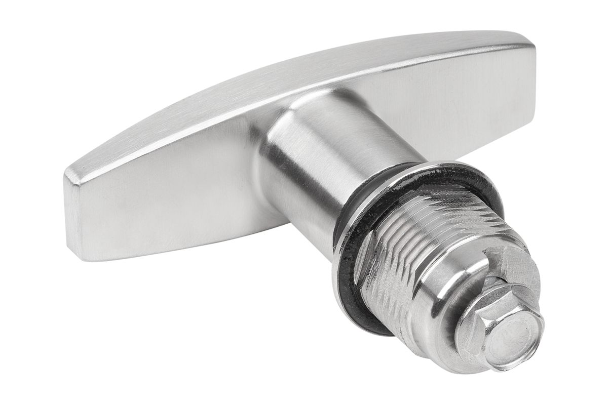 Zamek z uchwytem T. Możliwość zastosowania z prawej lub lewej strony z kątem zamykania 90°. Zamek może być wbudowany w postaci wstępnie zmontowanego zespołu. Dostawa ze standardową nakrętką ze stali nierdzewnej. Zamykany zamek obrotowy wyposażony jest w 2 klucze. Klucz można wyciągnąć w obu położeniach (otwartym i zamkniętym). Z zamkiem można zestawić każdy języczek (zamknięcie 1333).