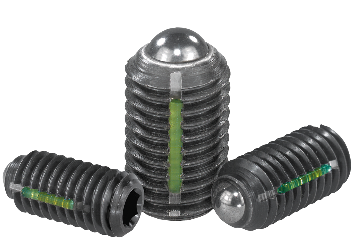 Zatrzaski kulkowe z gniazdem sześciokątnym, stal, zwiększona siła sprężyny, z zabezpieczeniem gwintu