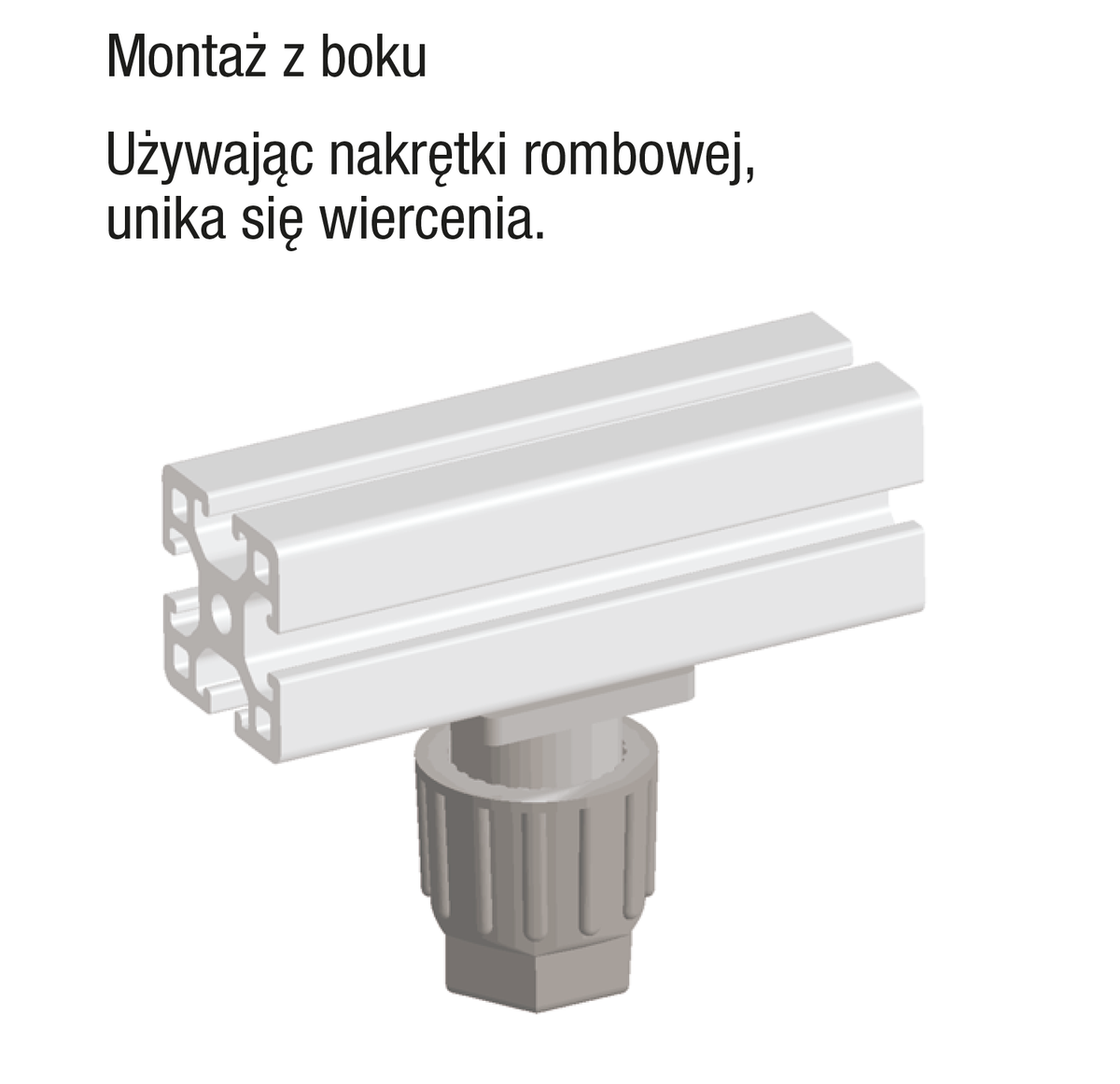 Nóżki nastawne najlepiej nadają się do stołów i lekkich przyrządów. Wysokość nóżki można nastawić bezstopniowo pokręcając nakrętkę ręką lub kluczem. Wpusty korpusu centrują i uniemożliwiając jego przekręcenie. Używając nakrętek prostokątnych (kamieni), można mocować nóżki w rowkach profili aluminiowych unikając wiercenia i gwintowania.