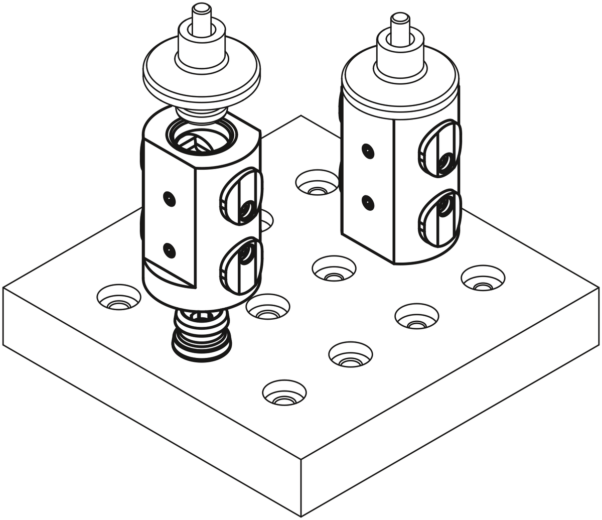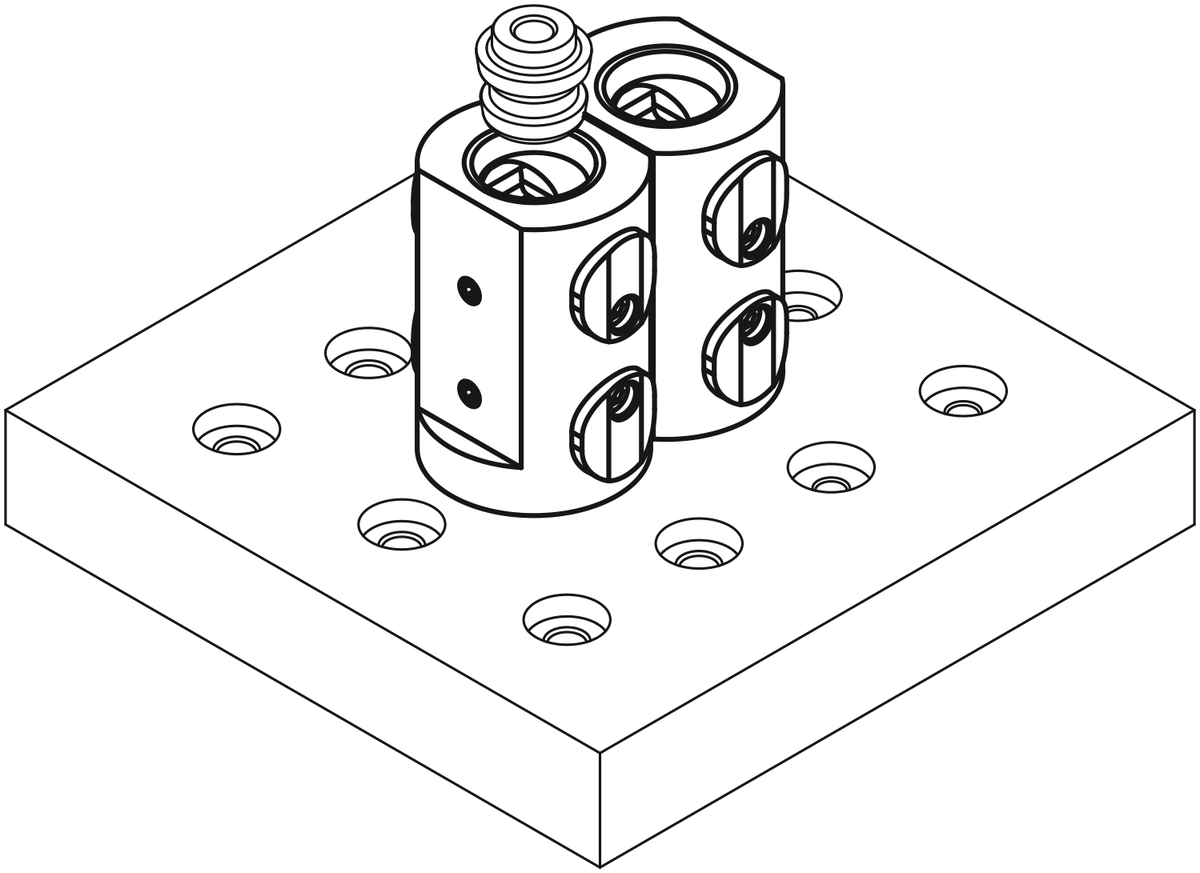 5-osiowe moduły bazowe UNILOCK z mocowaniem podwójnym można po odpowiedniej adaptacji stosować bezpośrednio na stołach maszynowych z siatką otworów lub rowkami teowymi, jak również na płytach z siatką otworów.